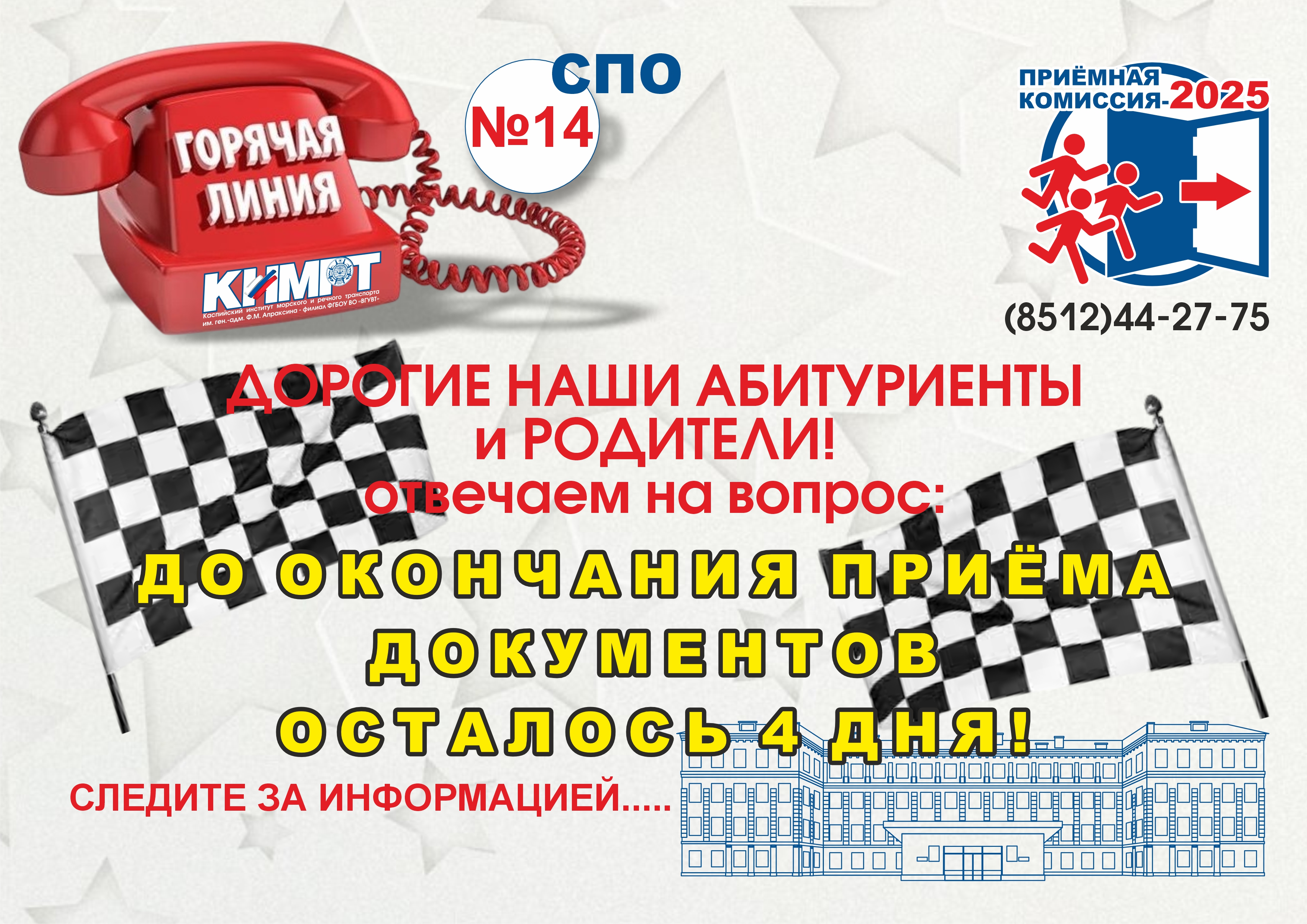 Дорогие наши абитуриенты и родители. Уже совсем скоро завершится приёмная кампания 2025 года. До её завершения остаётся всего 4 дня. Это значит, что 15 августа в 13.00 по местному времени, приём любых документов в приёмной комиссии Каспийского института морского и речного транспорта имени генерал-адмирала Ф.М. Апраксина будет прекращён полностью. Это значит, что все вопросы, которые […]