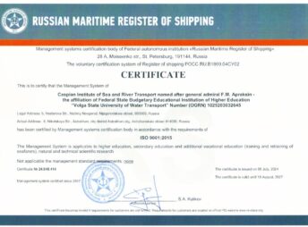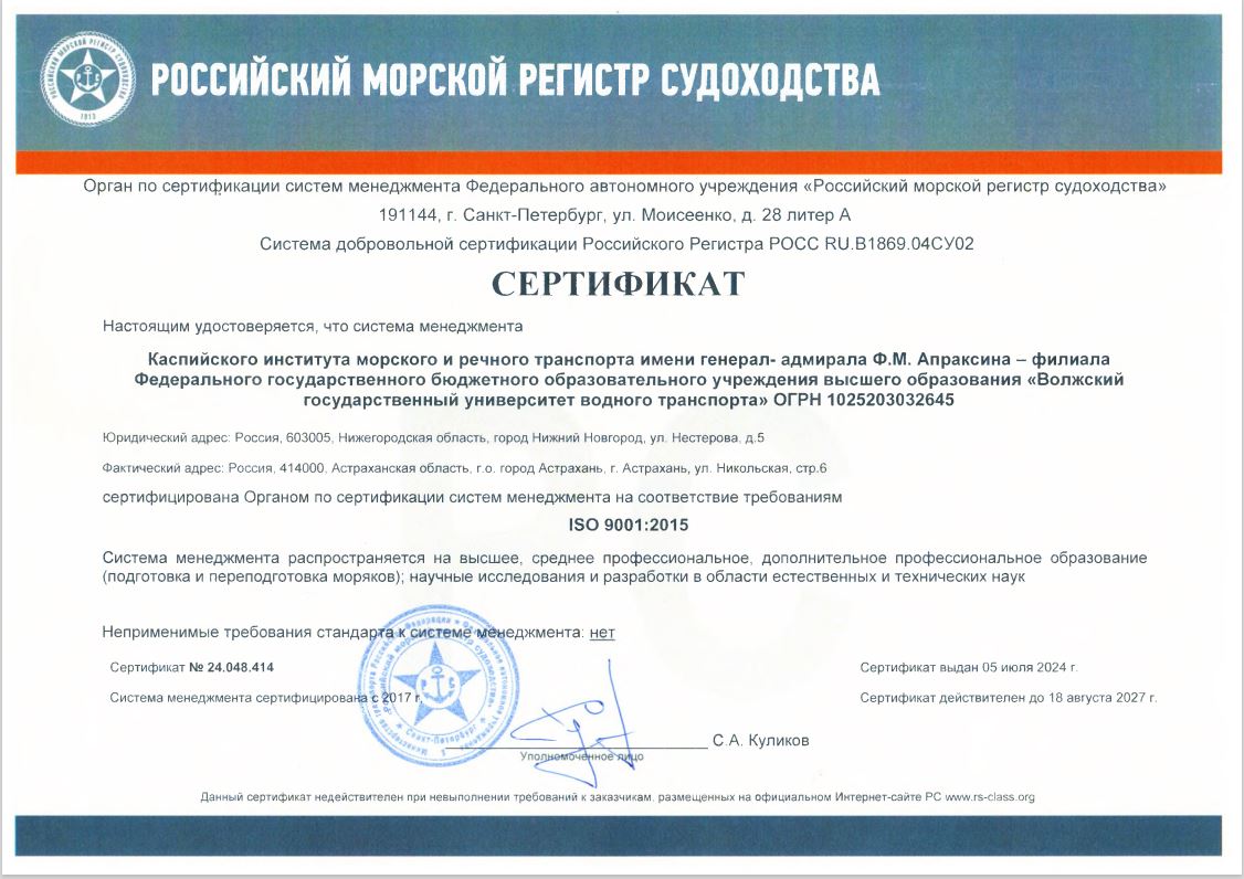 Система менеджмента качества в Каспийском институте морского и речного транспорта имени генерал-адмирала Фёдора Матвеевича Апраксина — филиале ФГБОУ ВО «ВГУВТ» сертифицирована Российским морским регистром судоходства на соответствие международному стандарту менеджмента качества ISO 9001:2015.