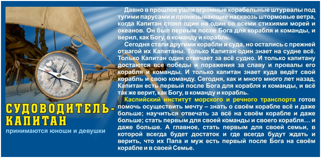 Специфика: «Судовождение на морских внутренних водных путях (река — море) с правом эксплуатации судовых энергетических установок».