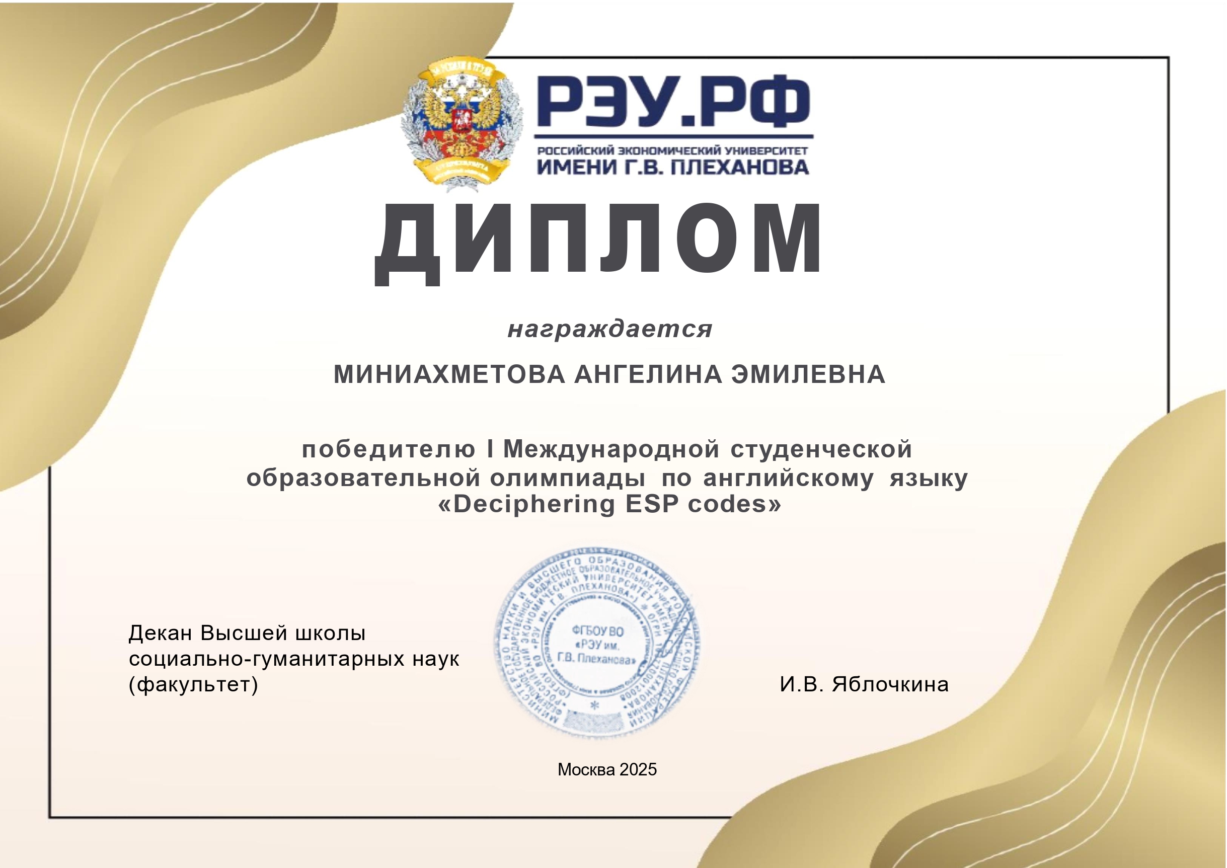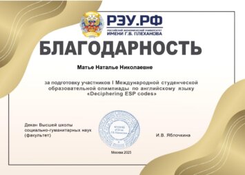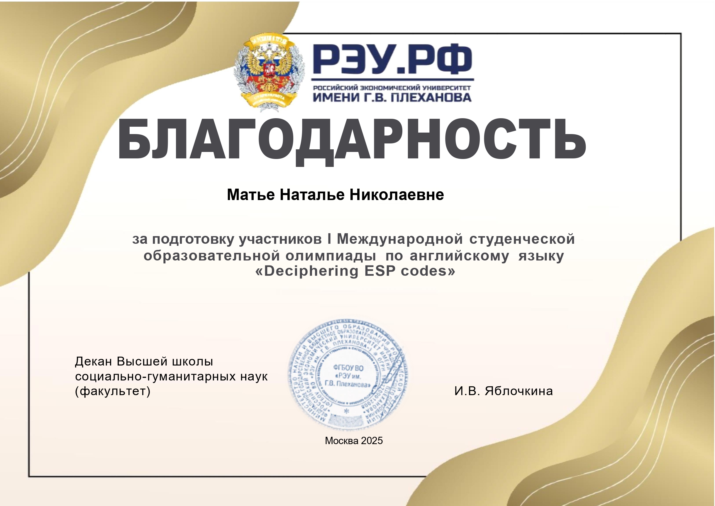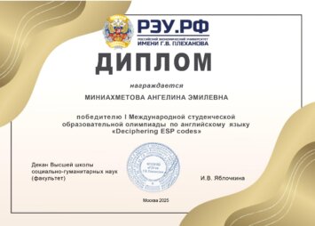 28 мая в онлайн-формате прошла I Международная студенческая образовательная олимпиада по английскому языку «Deciphering ESP codes». Организатором олимпиады выступила Высшая школа социально-гуманитарных наук и кафедра иностранных языков №2 Российского экономического университета им. Г.В. Плеханова (г. Москва).
