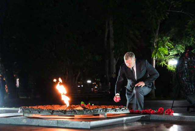 Глава региона возложил цветы в память о воинах, отдавших жизни в боях с немецко-фашистскими захватчиками, а также встретился с поисковиками, вручил активным участникам почетные грамоты, металлоискатель и пасхальные куличи.