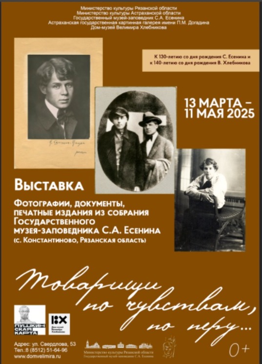 Выставка «Товарищи по чувствам, по перу…» приурочена к 130-летию со дня рождения Сергея Есенина и 140-летию со дня рождения Велимира Хлебникова, становится знаковым событием в юбилейный год и знаменует взаимодействие литературно-мемориальных музеев, посвящённых ключевым персоналиям русской литературы Серебряного века.